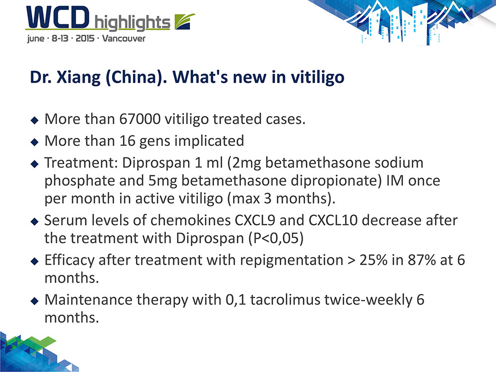 El Secretario General de la AEDV el Dr. Luis Ríos nos comenta los últimos avances sobre el vitíligo que expuso la Dra. Xiang en el 23º Congreso Mundial de Dermatología en Vancouver durante los días 8-13 de Junio y consiste en tratar el vitíligo activo con una inyección intramuscular de Diprospan que cuenta con una eficacia del tratamiento del 25% de repigmentación en 6 meses en más del 90% de los casos, con más 67.000 casos de vitíligo tratados.